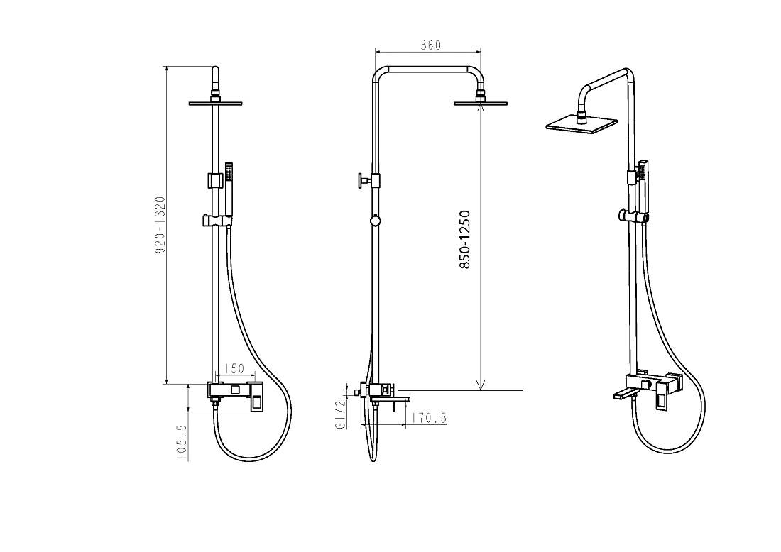 - Регулируемый размер душевой штанги: 920-1320 мм.