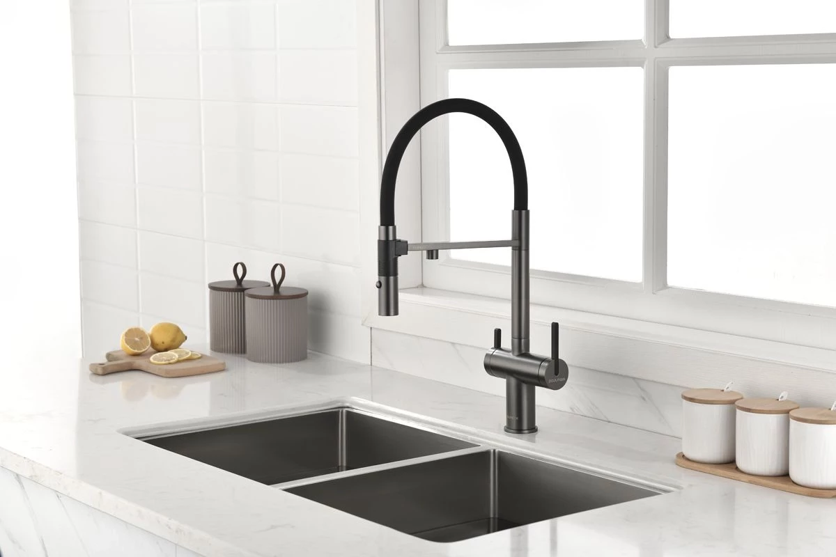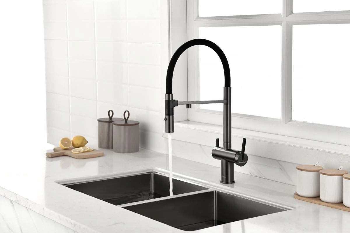Смеситель для кухни Paulmark MAGNETO ONE Ma213188-GM, с гибким изливом, цвет вороненая сталь, излив черный