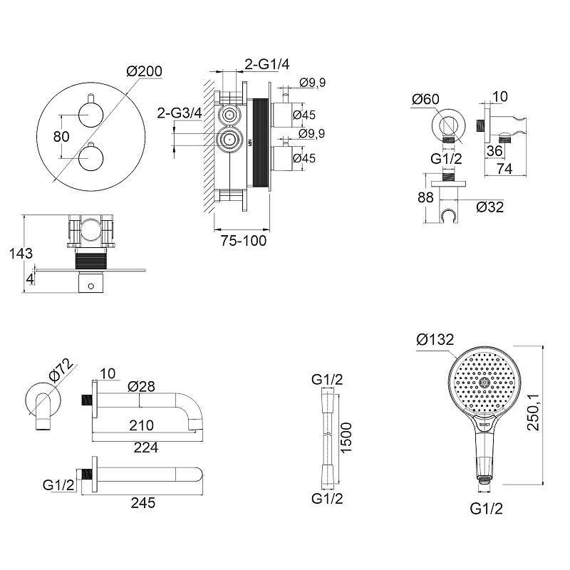 - Размер ручного душа (ШхВ): 132х250.,1.
