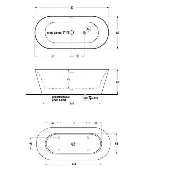 - Слив по центру.